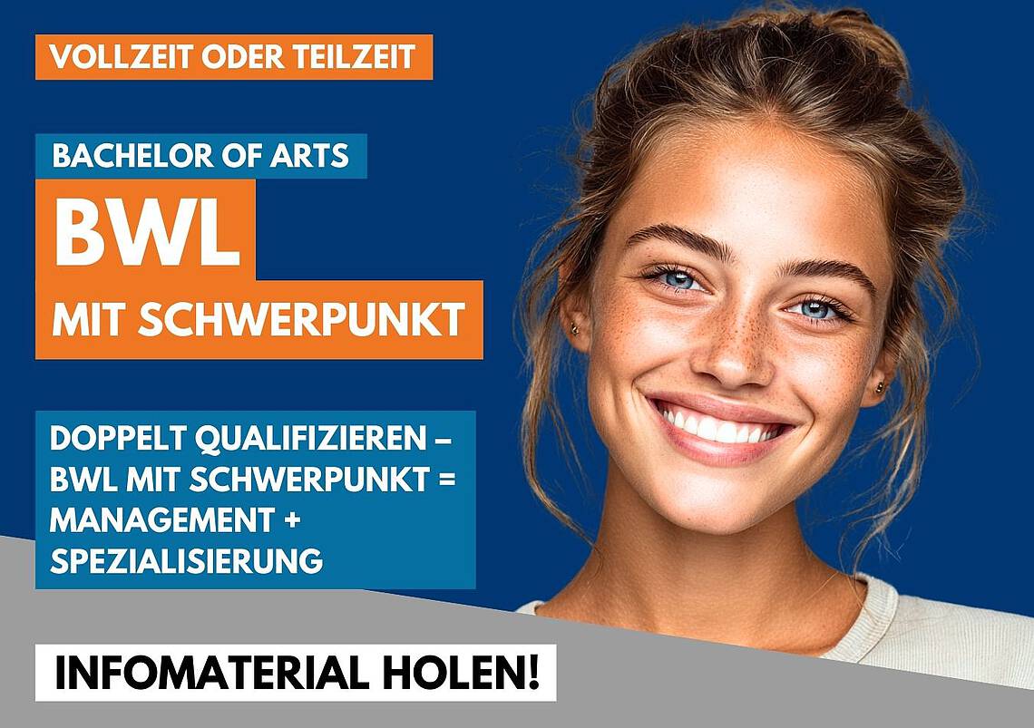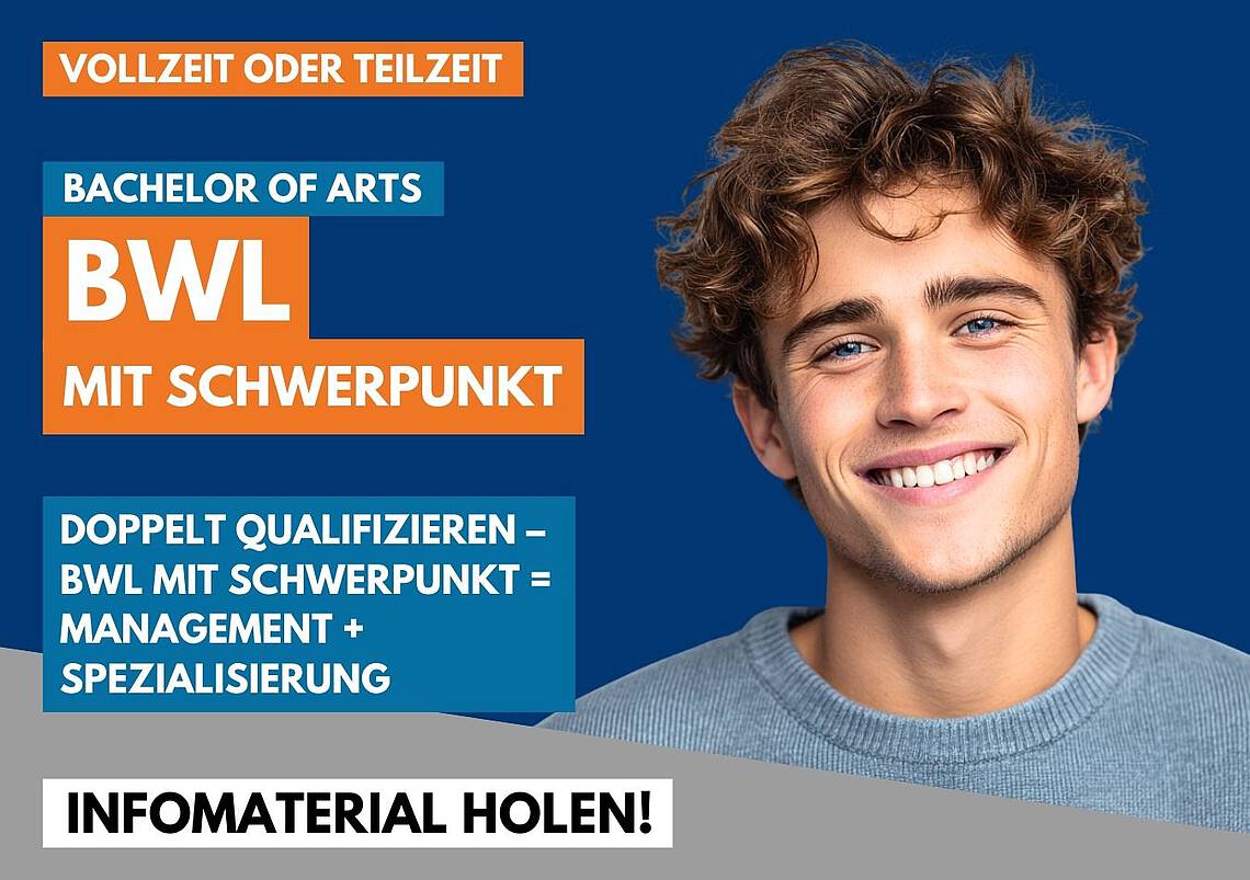 Unser B.A. in Betriebswirtschaft mit Schwerpunkt kombiniert solide betriebswirtschaftliches Wissen mit praxisnahen Schwerpunkten. Du lernst Management, Controlling & Co. – und vertiefst dich gezielt in das Feld, das zu deinen Zielen passt.