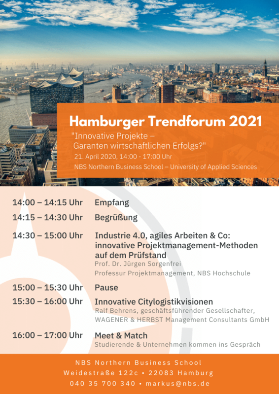 Am Mittwoch, den 21. April 2021, lädt die NBS Northern Business School – University of Applied Sciences zum "Hamburger Trendforum" ein, einer Veranstaltung für Fachvorträge und Networking im Bereich Betriebswirtschaft. Im Mittelpunkt der Veranstaltung stehen spannende Fachvorträge von Experten des Projektmanagements zum Thema Innovations- und Projektmanagement sowie der Austausch zwischen Wissenschaftlern, Studierenden und Praxisvertretern beim abschließenden Networking.