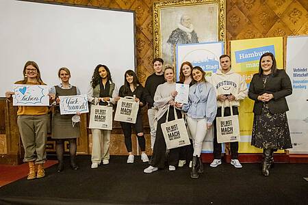 In Vertretung sprach Senatorin Anna Gallina (Präses der Behörde für Justiz und Verbraucherschutz) ein Grußwort, in dem sie die Studierenden als Hauptpersonen der Veranstaltung im Rathaus begrüßte und sie alle zur Teilnahme am Hochschulwettbewerb beglückwünschte: