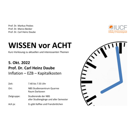 Heute, den 05. Oktober 2022, um 07:40 Uhr fand wieder "WISSEN vor ACHT", eine Studiengang- und Semester-übergreifende Veranstaltung des Institutes für Unternehmensrechnung, Controlling und Finanzmanagement (IUCF) im Studienzentrum Quarree statt.