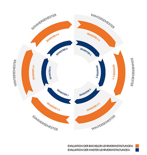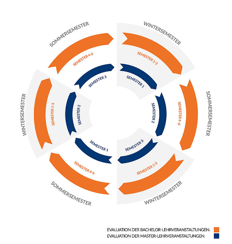 - Regelmäßigkeit: Jede Lehrveranstaltung wird mindestens alle eineinhalb Jahre standardmäßig evaluiert (siehe Grafik unten).