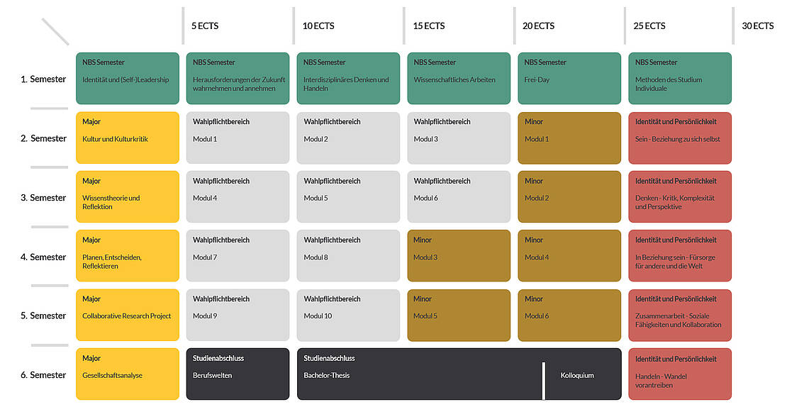 - NBS-Einführungssemester: Vermittelt wissenschaftliche Arbeitsmethoden, fördert Selbstreflexion und hilft den persönlichen "inneren Kompass" für das Studium zu entwickeln[9]. Bereits hier werden zukünftige Herausforderungen wie Digitalisierung oder Klimawandel thematisiert[10]